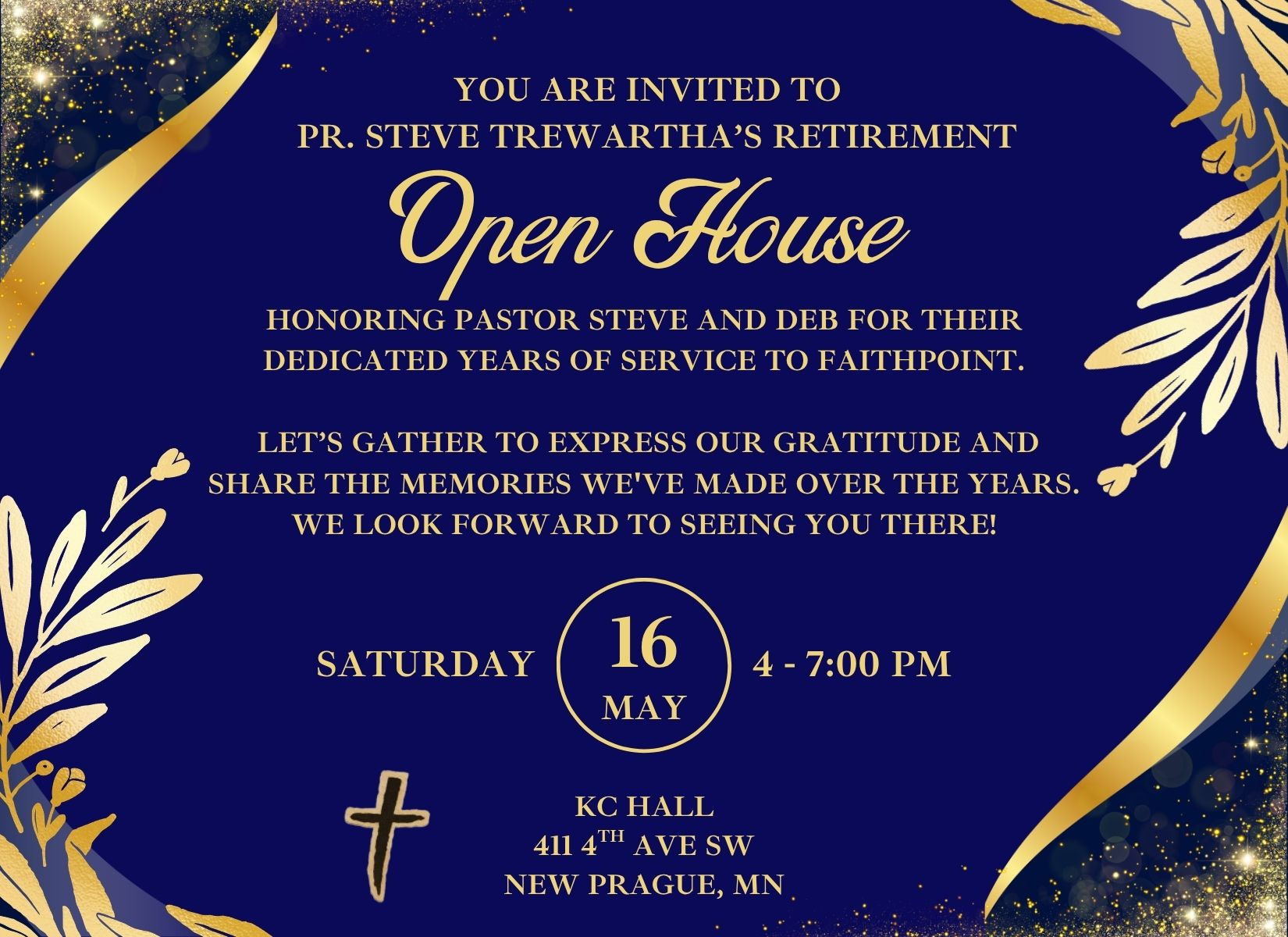 Pr. Steve’s Retirement Open House will be held on Saturday, May 16 from 4-7pm at the KC Hall in New Prague. Mark your calendars and plan to join us as we honor Pr. Steve & Debbie for their dedicated years of service and legacy at FaithPoint! Everyone is invited so spread the word!
