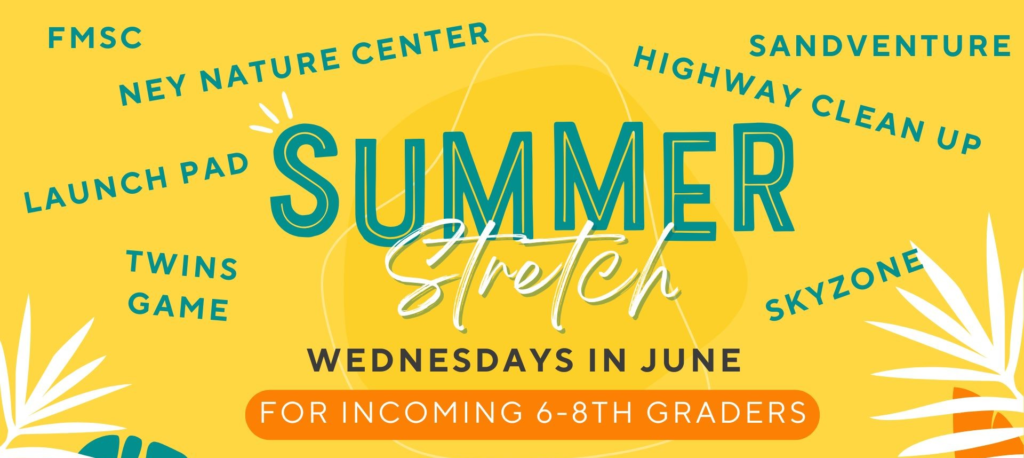 June 3- FMSC/SkyZoneJune 10- Highway Pickup/SandventureJune 17- Ney Nature Center/LaunchPadJune 24- AFTERNOON Food Drive/Twins Game
